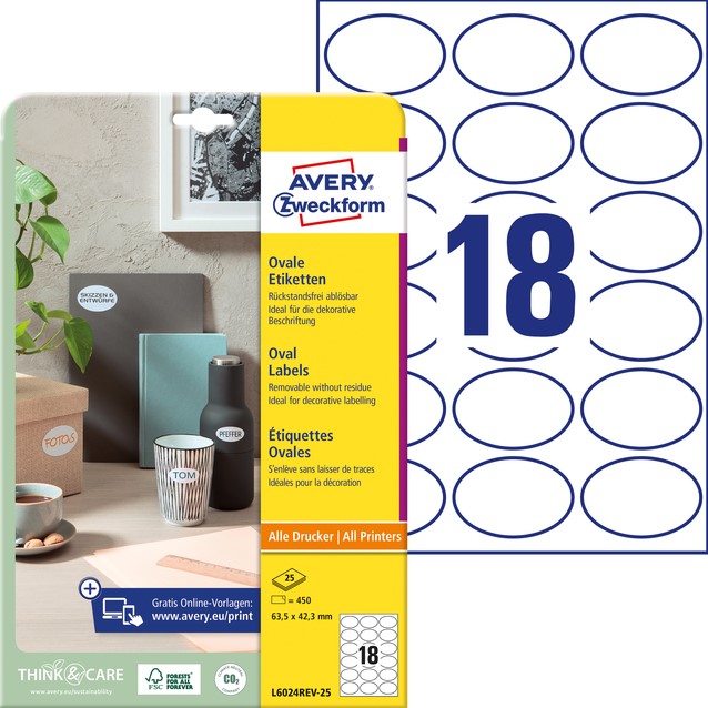 • Avery ovale productetiketten trekken de aandacht bij promoties, zijn eenvoudig te ontwerpen met Avery software en verkrijgbaar in diverse formaten en kleuren.