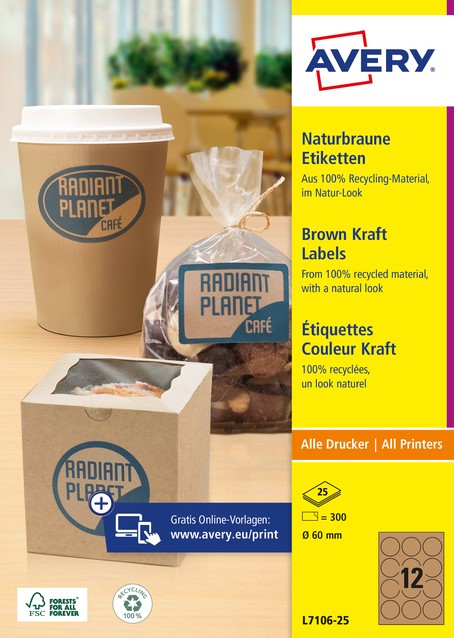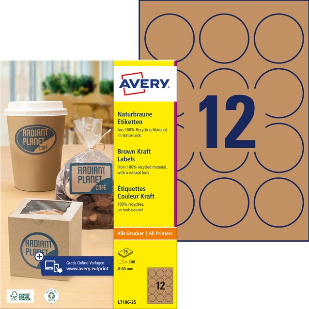 • Avery kraft, 100% gerecyclede productetiketten geven een natuurlijke uitstraling, zijn geschikt voor alle A4-printers, goed hechtend op diverse ondergronden en eenvoudig te ontwerpen met gratis online templates.