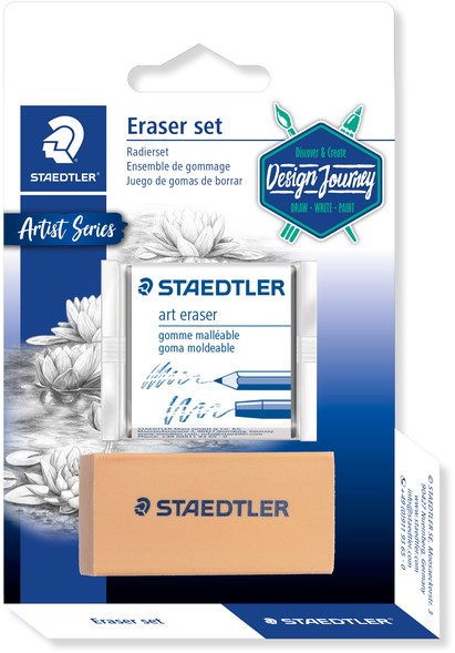 STAEDTLER gommenset. Kneedbare reinigingsgom voor speciale doeleinden, waarmee het opnemen en verwijderen van pastel-, grafiet- en houtskooldeeltjes heel eenvoudig wordt. Deze hoogwaardige veegvrije gom biedt optimale ondersteuning bij het maken van tekeningen met krijt, houtskool en potlood. Blisterkaart DESIGN JOURNEY met kneedgom en speciale gom voor het reinigen van tekematerialen en het verwijderen van vuil of vegen.