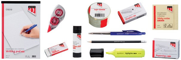 • Inhoud koffer: schrijfblok, zelfklevend memoblok, plakband, highlighter, pen, potlood, lijmstift, correctieroller, paperclips en nietjes.