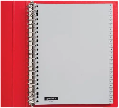 • Voor maximale structuur in grote documentverzamelingen zijn de Quantore tabbladen 23-gaats 1-100 genummerd grijs de perfecte keuze. Deze robuuste tabbladen zijn vervaardigd uit grijs polypropyleen en bieden langdurige stevigheid, zelfs bij intensief gebruik. De tabs zijn duidelijk genummerd van 1 tot 100 en eenzijdig zwart bedrukt, zodat je razendsnel de juiste sectie vindt. Met de universele 23-gaats perforatie passen ze moeiteloos in vrijwel elke ringband of ordner. Ideaal voor omvangrijke archieven, opleidingsmateriaal, jaaroverzichten of projectfaseringen waarin overzicht essentieel is. Kenmerken: