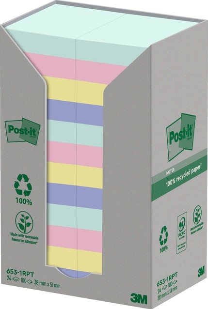 • Post-it® Recycled Notes worden gemaakt van 100% gerecycled papier en met een lijm op basis van een hernieuwbare natuurlijke bron, 60% komt van een plant die jaarlijks weer aangroeit. Ze zijn PEFC RECYCLED gecertificeerd. De grondstoffen komen uit gecertificeerde, hernieuwbare en verantwoord beheerde bossen.