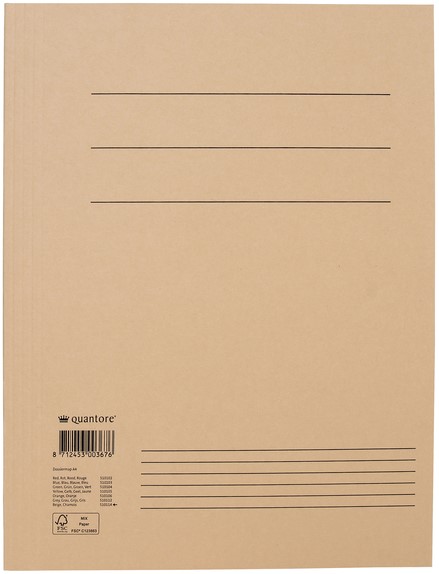 • Door (leverproblemen) leveren we momenteel een alternatief zonder opdruk uit. Afbeelding wijkt af van de werkelijkheid Kies voor duurzaamheid en kwaliteit met de dossiermap Quantore A4 250gr chamois. Deze stevige map is vervaardigd uit 250 grams gerecycled manillakarton en biedt optimale bescherming voor je documenten. Dankzij de drie stofkleppen blijven losse papieren netjes op hun plaats, ideaal voor gebruik in archieven, kantoren of thuis. De map voldoet aan de Blauwe Engel- en FSC-certificeringseisen, wat garant staat voor milieuvriendelijk materiaalgebruik. Met het A4-formaat is de map perfect afgestemd op standaarddocumenten. Verpakt per 5x10 stuks in een omdoos – klaar voor intensief gebruik. Kenmerken: