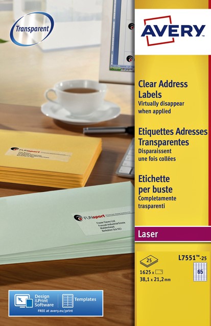 Etiket Avery L7551-25 38.1x21.1mm transparant 1625 stuks
