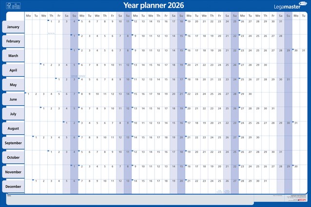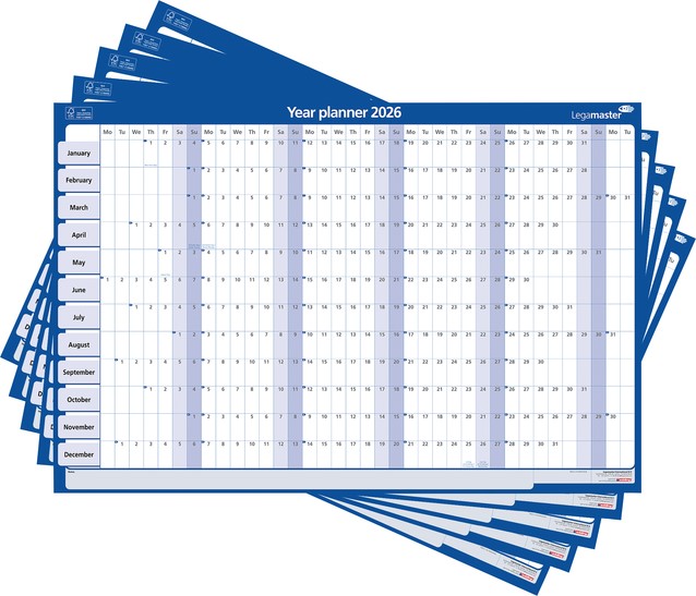 Het gebruik van een jaarplanner is een praktische en visueel aantrekkelijke manier om je planning, evenementen en taken voor het jaar te organiseren. Hang op een zichtbare plek: Zoek een prominente plek in je huis of kantoor. Gebruik verschillende kleuren markers of stiften om belangrijke data zoals afspraken en deadlines te markeren. Algemene feestdagen zijn voorbedrukt. Gelamineerde Engelstalige jaarplanner van 60x90cm. De laminering beschermt het karton tegen slijtage en maakt de planner duurzamer en zorgt voor een langere levensduur. Op het gladde, beschrijfbare oppervlak van het gelamineerde karton kun je eenvoudig schrijven en wissen bij gebruik van droog uitwisbare markers. Markeringen kunnen eenvoudig worden gewist met een vochtige doek of een gum. Jaarplanner met de dagen aan de bovenkant (alleen de eerste twee letters) en de maanden langs de zijkant. Weekends zijn in een andere kleur gemarkeerd. Extra ruimte voor aantekeningen aan de rechterkant van de planner. Weeknummers zijn in het design opgenomen. Afmeting raster ongeveer: H42 x W22 mm. Deze jaarplanner is gemaakt van materiaal uit goed beheerde, FSC®-gecertificeerde bossen en andere gecontroleerde bronnen (FSC C158462).