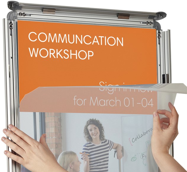 • Wandgemonteerd poster frame voor het veilig ophangen van posters, borden en informatie. De handige aluminium clicklijst zorgt voor een professionele afwerking en maakt het mogelijk snel en eenvoudig de inhoud te wisselen.