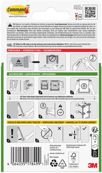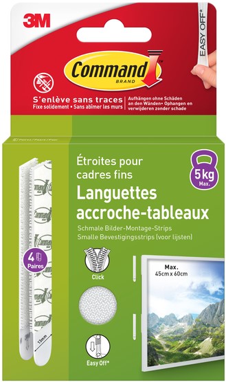 • Command™ Smalle bevestigingsstrips zijn onze innovatieve oplossing voor het veilig en zonder beschadigingen ophangen van afbeeldingen in smalle lijsten. Ze hechten sterk en laten na verwijdering geen sporen achter dankzij de 3M rekontgrendelingstechnologie.