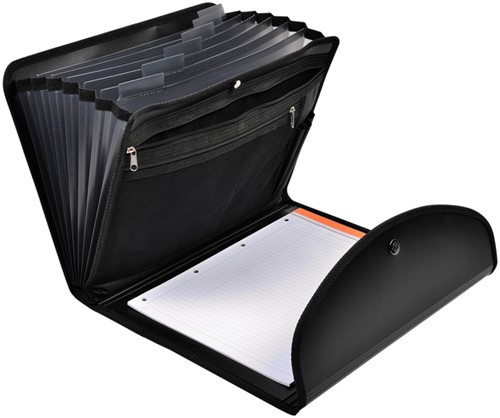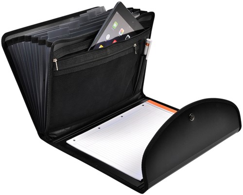 • Voorordner voorzien van een klembord en notitieblok, een vakje met ritssluiting en een pennenhouder.