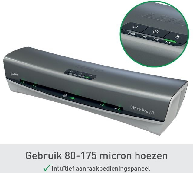 • Elegant en geavanceerd, de Leitz iLAM Office Pro A3 lamineermachine combineert stijl met hoge prestaties. Ontworpen voor eenvoudig en intensief gebruik op kantoor.