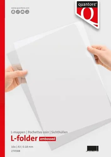 • De Quantore insteekmap in L-model is de ideale oplossing voor het beschermen en presenteren van A3-documenten. Gemaakt van stevig en transparant polypropyleen met een lichte nerfstructuur, waardoor je documenten goed zichtbaar blijven en tegelijk beschermd zijn tegen vuil, stof en beschadigingen. Dankzij het L-model zijn de boven- en rechterzijde open, wat het eenvoudig maakt om papieren in en uit te nemen. De map is copysafe, zodat je afdrukken niet verkleuren of vastplakken. Kenmerken: