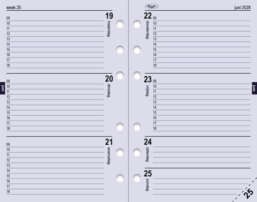 • U krijgt 160 pagina's wit papier met blauwe opdruk, met één week op 2 pagina's en een voorgedrukte tijdsindeling van 9:00 uur tot 18:00 uur.