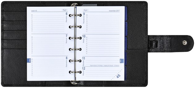 • De organizer is voorzien van tabbladen, doorzichtig vak met rits, pagina-scheider, notitieblaadjes en adresboekje.