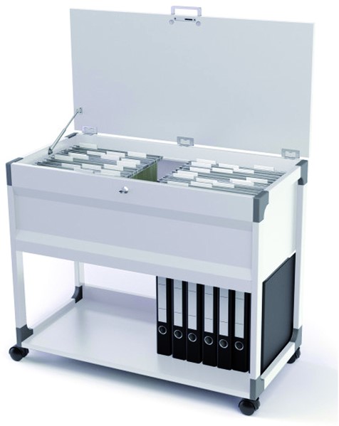 • Afsluitbare archieftrolley voor ongeveer 100 hangmappen of 10 standaard hangordners (80mm) of 18 dunne hangordners (40mm).