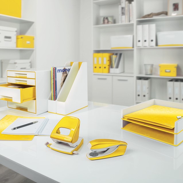 • Onze Leitz WOW ringband heeft een opvallend geometrisch patroon en is de perfecte keuze voor iedereen die op zoek is naar een stijlvolle en functionele oplossing voor het organiseren van documenten. Deze ringband is gemaakt van robuust en stevig grijs karton, overtrokken met bedrukt papier en afgewerkt met een transparante folie. Door de gele glanzende omslag is deze map een kleurrijke toevoeging aan je kantoor- of studieruimte. Perfect voor studenten, professionals en iedereen die houdt van een trendy en decoratieve opbergmap.
