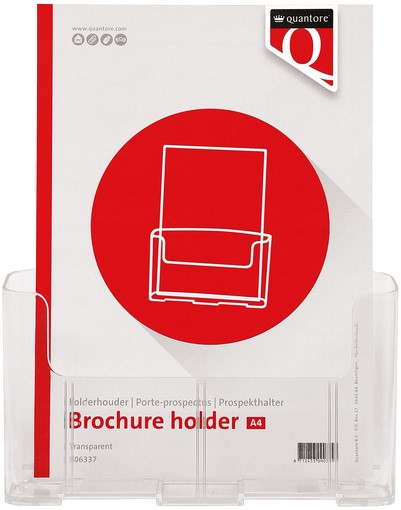 • Met de folderhouder van Quantore A4 presenteer je folders en brochures altijd overzichtelijk en professioneel. De transparante uitvoering zorgt ervoor dat je communicatiemateriaal goed zichtbaar is en direct de aandacht trekt. Dankzij de opening aan de bovenzijde plaats je folders eenvoudig en snel, terwijl de lichte buiging naar achteren een optimale leeshoek biedt. De stabiele onderkant houdt de houder stevig op zijn plek, zelfs bij intensief gebruik. Gemaakt van stevig polystyreen en voorzien van een vulbreedte van 3,9 tot 4 cm binnenmaat, is deze folderhouder ideaal voor winkels, kantoren, beurzen en openbare ruimtes. kenmerken:
