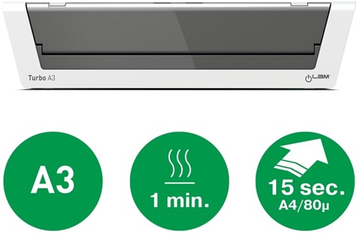 • Volautomatische A3 hoge snelheid premium lamineermachine met unieke sensortechnologie. Herkent de dikte van het document en selecteert automatisch de juiste snelheid. Geschikt voor 80-250 micron. Opwarmtijd slechts 1 minuut. Voor intensief professioneel gebruik.