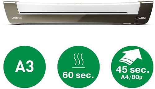 • A3 lamineermachine in mooi design met korte opwarmtijd. Opwarmtijd slechts 1 minuut. Geschikt voor 80 tot 125 micron.