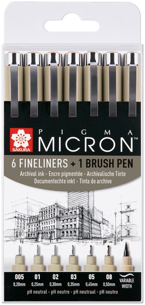 Fineliner Sakura Pigma Micron set à 6 schrijfbreedtes met brushpen zwart