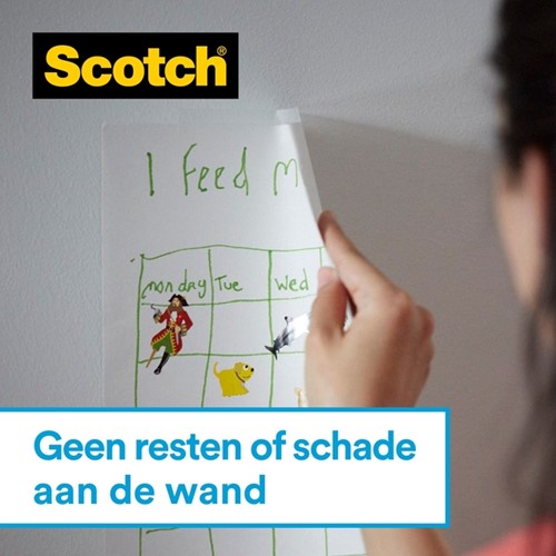 • POST-IT® kleeftechnologie: Scotch® Wall-Safe Tape wordt ondersteund met unieke Post-It® Brand kleeftechnologie die ervoor zorgt dat uw foto's, kunstwerken en decoraties stevig aan de muur worden bevestigd.