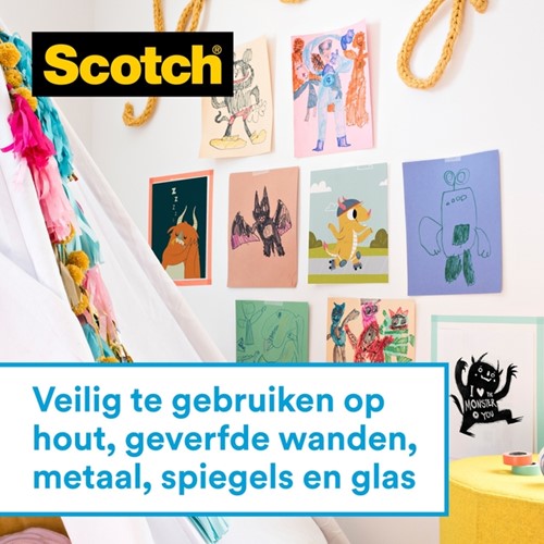 • Laat zien wat u dierbaar is zonder uw wanden te beschadigen, met Scotch® Muurveilige Band. Scotch® Wall-Safe Tape plakt stevig, maar laat na verwijderen geen sporen achter van muren en andere thuis- en kantooroppervlakken. De plaktape hecht zich op verschillende oppervlakken en is veilig voor geverfde muren, roestvrij staal, hout, tegels, spiegels en ramen. Toon vol display foto's en posters zonder dat u zich zorgen hoeft te maken over resten of schade aan de muur.
