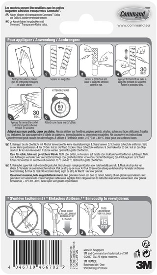 • De Command™ Kleine transparante draadhaken met transparante strips zijn onze innovatieve oplossing voor het veilig en zonder beschadiging ophangen van versieringen, kalenders en andere lichte voorwerpen. Ze hechten sterk en laten na verwijdering geen sporen achter dankzij de 3M rekontgrendelingstechnologie.