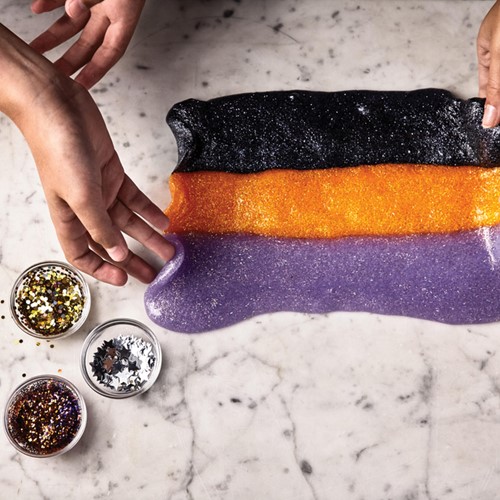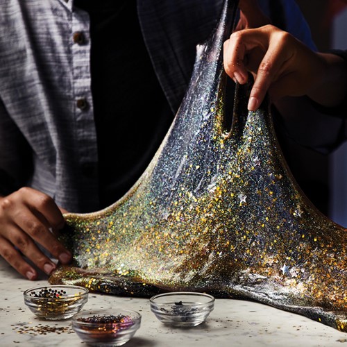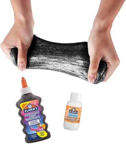 • Voor een gladde, glinsterende slijm voeg gewoon Elmer's Magic Liquid; een minder knoeierige slijmactivator van Elmer's, toe en creëer je eigen glitterslijm.