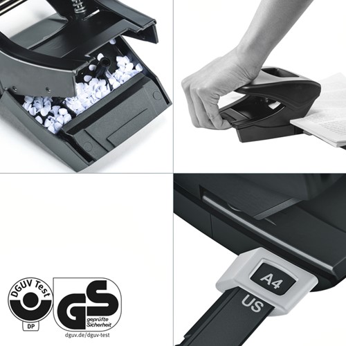 • Gemakkelijk te legen, scharnierend opvangbakje voor papiersnippers.