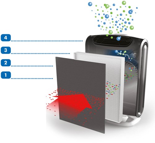 • Vier-fasen reinigingssysteem reinigt 99.97% van de luchtverontreinigde deeltjes tot 0.3 micron uit de lucht, inclusief pollen en andere allergenen, stofmijt, schimmelsporen, huidschilfers van dieren en sigarettenrook.