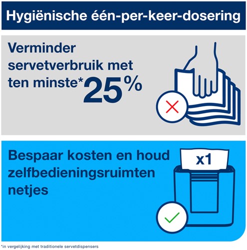 • Dankzij de gebruiksvriendelijke één-per-keer-dosering wordt er minstens 25% minder servetten verbruikt vergeleken met traditionele servetdispensers.