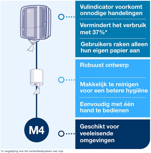 • Deze dispenser vermindert ook het afval, het verbruik valt to 37% lager uit ten opzichte van het Tork® Centerfeed-systeem.