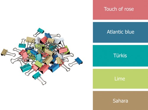 • De metalen beugels kunnen verwijderd worden, zo blijft alleen de klem op het document achter en nemen de beugels géén extra ruimte in. Bestaande uit: 18 x klemwijdte 19 mm (4 witte, 4 rode, 4 blauwe, 3 gele en 3 groene); 6 x klemwijdte 25 mm (wit, geel, rood, groen en 2 x blauw).