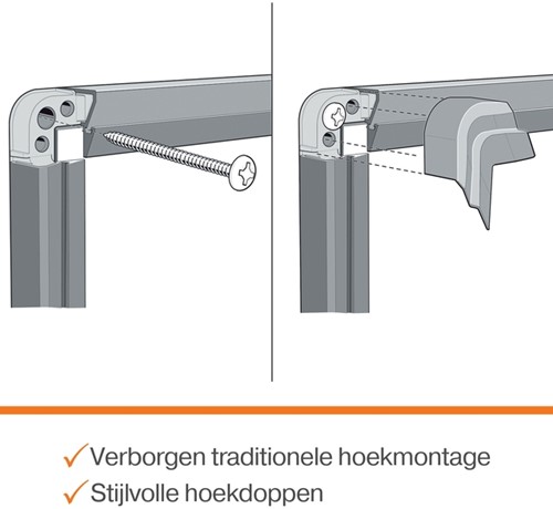• Bevestigd met een traditionele hoekmontage aan de wand die wordt verborgen door stijlvolle hoekelementen.