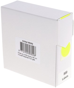 • Fluor gele ronde etiketten in kartonnen dispenser.