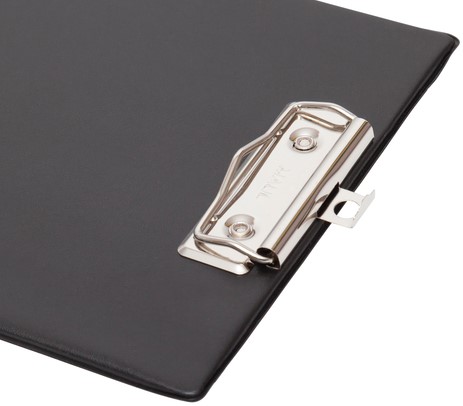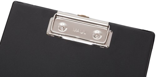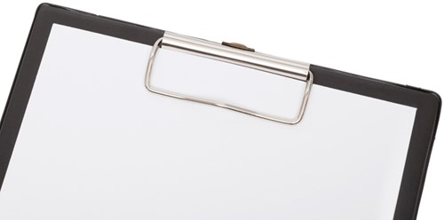 • Het klembord bevat een platte, verchroomde beugelklem met grijpring.