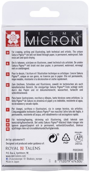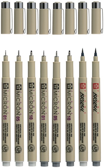 Fineliner Sakura Pigma Micron set à 6 schrijfbreedtes met twee brushpennen koudgrijs