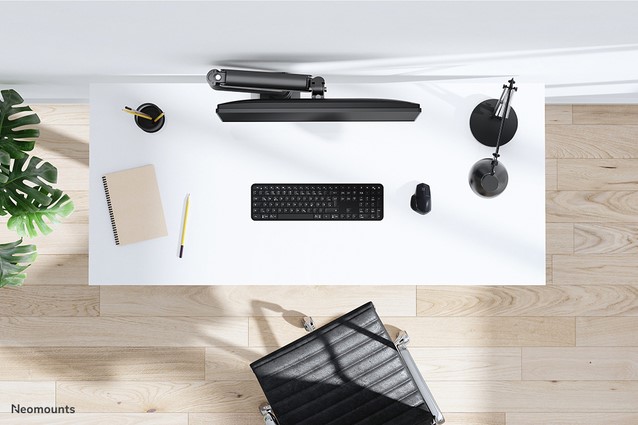 • De arm is voorzien van gasgeveerde hoogteverstelling (26,1-55 cm) en diepteverstelling (0-51,4 cm), VESA quickrelease, 180°-stopmechanisme, waardoor deze goed bij een akoestische wand gebruikt kan worden, standaard uitgerust met een platte topfixklem en bureaudoorvoer.