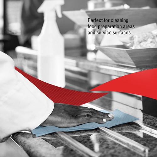 • Deze blauwe WypAll-poetsdoeken kunnen eenmalig worden gebruikt met reinigingsmiddel of desinfectiemiddel. Deze Kimberly-Clark-poetsdoeken zijn getest en geschikt bevonden voor gebruik met sprays die perazijnzuur, waterstofperoxide en 'quats' (quaternaire ammoniumverbindingen) bevatten. Dankzij de geschiktheid voor bevochtiging met een spray en schoonvegen, kunnen werknemers hun eigen werkplek, voertuig, bureau, stoel en voedselbereidingsruimte voor en na gebruik schoonvegen. Sproeien en afvegen helpt productiemedewerkers ook om hun eigen werkstation schoon te maken/te ontsmetten voordat ze deze aan de volgende werkploeg overdragen. Voor omgevingen waar schoonvegen met een volledig doordrenkte poetsdoek een vereiste is, zijn deze WypAll-schoonmaakrollen getest en geschikt bevonden voor sop/schoonmaakmiddel. Volg altijd de instructies van de fabrikant voor verdunning, toepassing en contacttijd op.